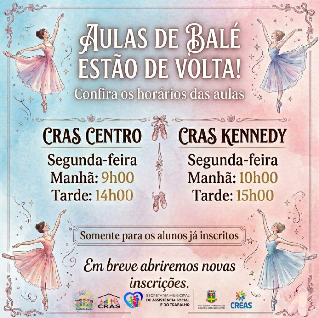 A partir da próxima segunda-feira (27/04), as aulas de balé retornam oficialmente às unidades do CRAS Centro e CRAS Kennedy, em Cruzília. A iniciativa, coordenada pela Secretaria de Assistência Social e Trabalho, beneficia as crianças já matriculadas ao promover o fortalecimento de vínculos sociais e familiares, além de incentivar o desenvolvimento físico e emocional por meio da expressão artística. O retorno das atividades marca um momento de integração e cuidado com os jovens talentos do nosso município.