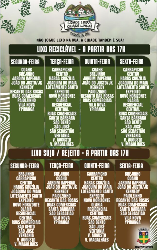 Para mantermos nossa “Cidade Limpa, Cidade Linda”, é fundamental que todos colaborem respeitando os dias e horários da coleta. Confira abaixo quando o caminhão passa no seu bairro!