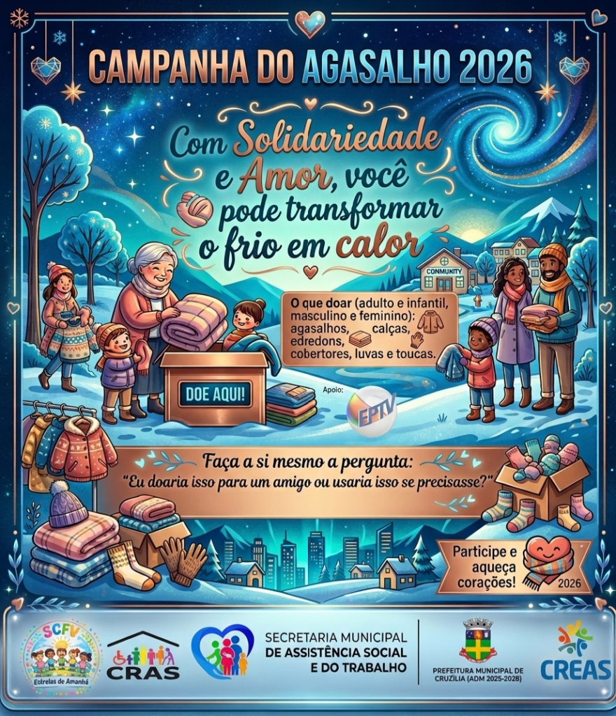 Desde a última segunda-feira (20/04), a Secretaria Municipal de Assistência Social e Trabalho promove em Cruzília a “Campanha do Agasalho 2026”. A iniciativa convida toda a população a doar itens de inverno em pontos estratégicos da cidade até o dia 31 de julho, visando amparar cidadãos em situação de risco social durante o período de baixas temperaturas. A ação busca fortalecer a rede de solidariedade local, garantindo que o frio seja enfrentado com mais dignidade, conforto e proteção por quem mais precisa.
