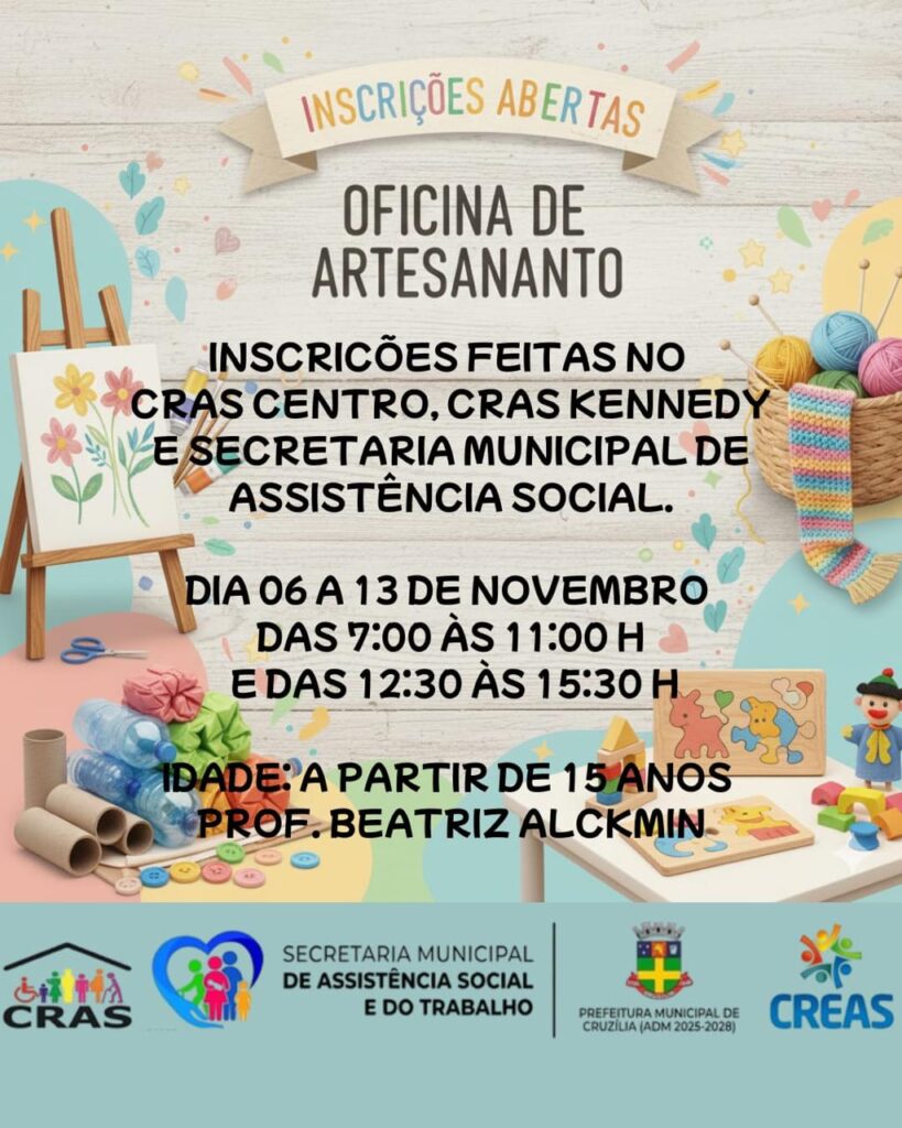 A Prefeitura de Cruzília, por meio da Secretaria Municipal de Assistência Social e do Centro de Referência de Assistência Social (CRAS), inicia as inscrições para a Oficina de Artesanato. Os interessados devem procurar o CRAS Centro, o CRAS Kennedy ou a sede da Secretaria entre os dias 6 e 13 de novembro para garantir a vaga. A ação é destinada a moradores com 15 anos ou mais e busca promover a integração comunitária.