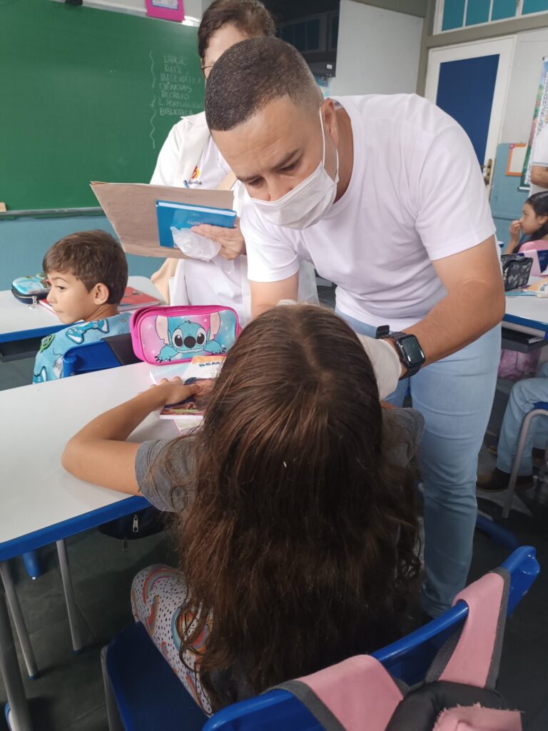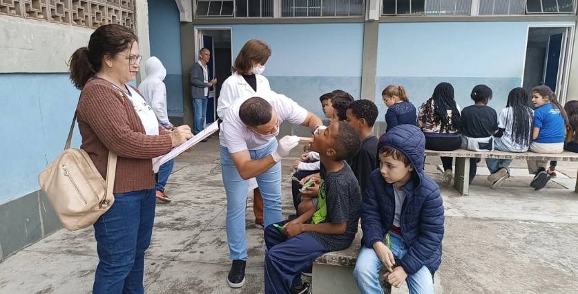Estudantes recebem kits de higiene, orientações sobre escovação e avaliação clínica para prevenir doenças bucais.