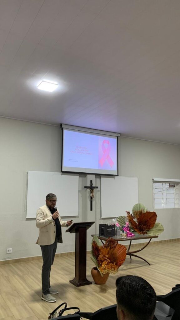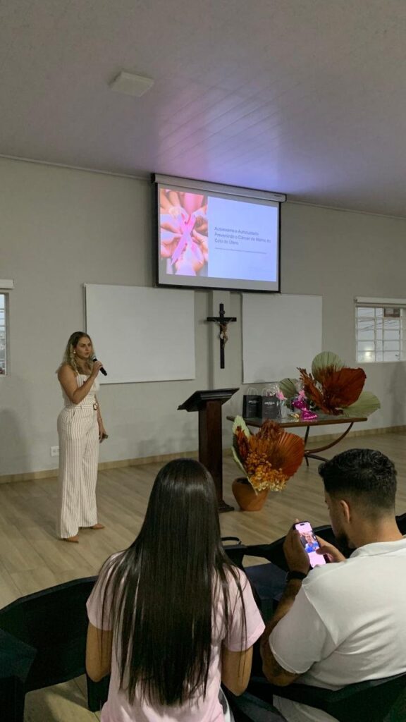A programação foi desenhada para informar e inspirar. O Dr. Maxmuller Mângia iniciou os trabalhos com a palestra “Saúde da Mulher: Câncer de mama e do colo do útero”. Na sequência, a Enfermeira Estomaterapeuta Lais Oliveira conduziu a palestra “Autoexame e Autocuidado”, focada no conhecimento do corpo como ferramenta de prevenção. O evento também contou com o relato inspirador de Karina Luiza de Souza, que compartilhou sua jornada de superação contra o câncer de mama, abordando a descoberta, o tratamento e o recomeço.