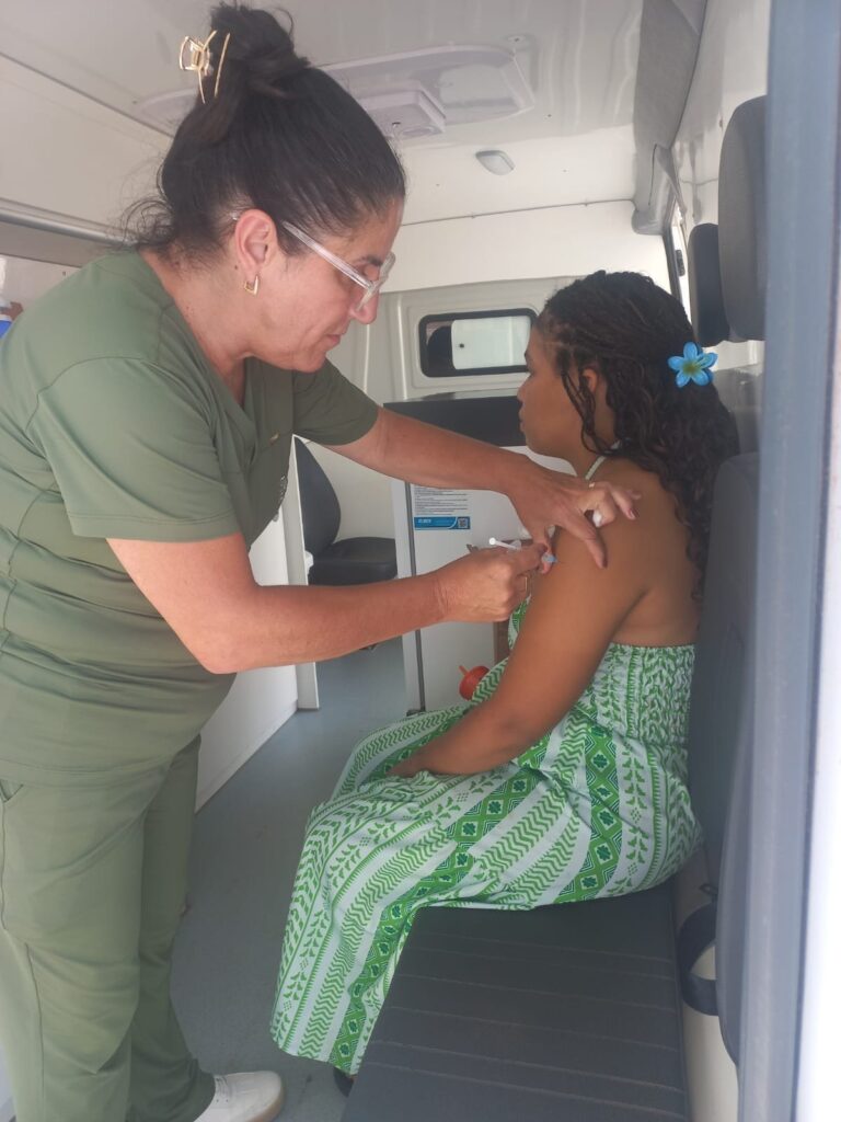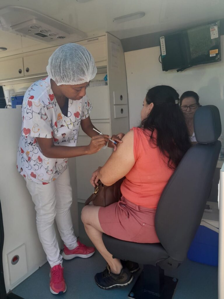 Unidade móvel percorre bairros para atualizar cartões de vacina e aplicar doses do calendário nacional em moradores de todas as idades.