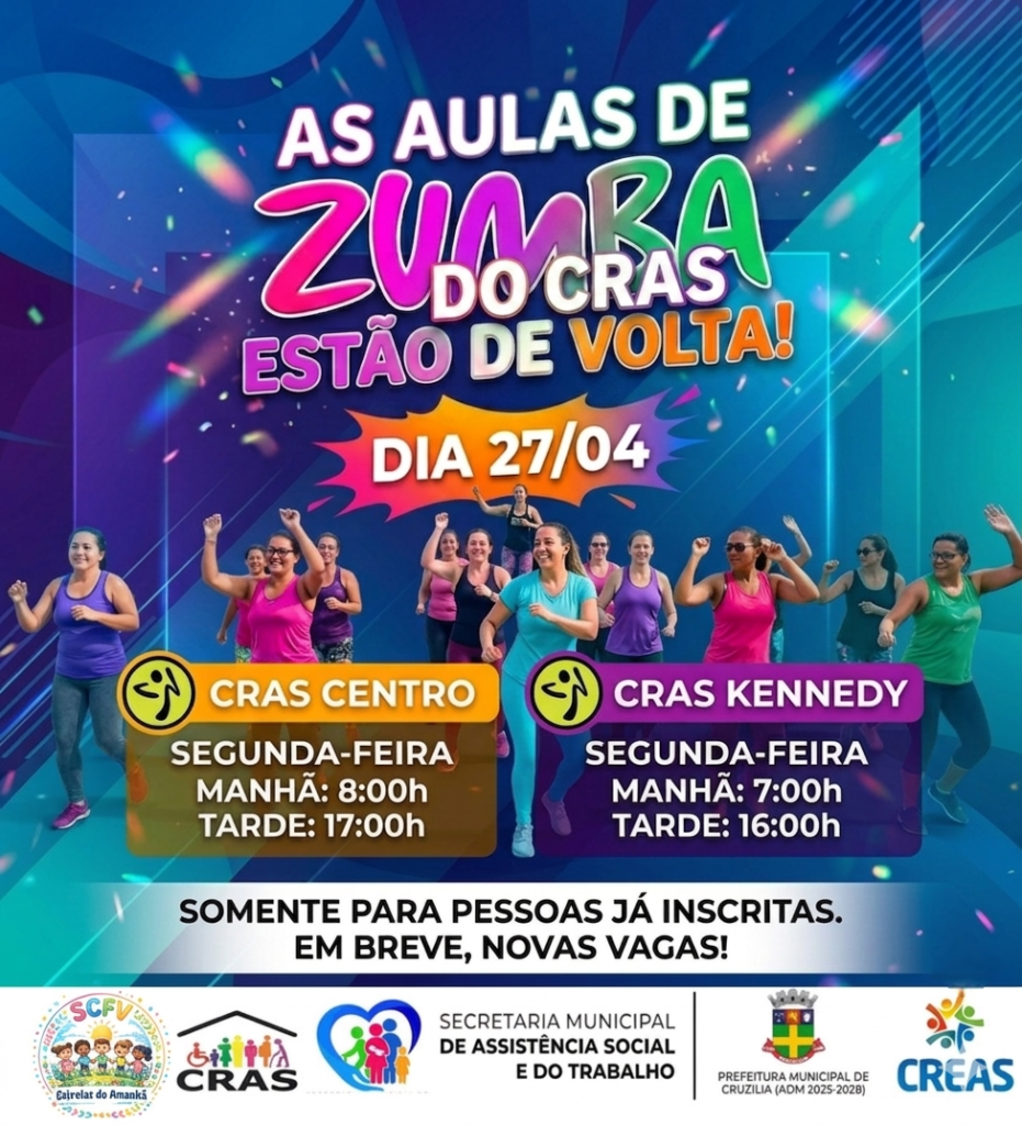 💃✨ A Zumba está de volta! No dia 27/04, as aulas retornam ao CRAS Centro e CRAS Kennedy para quem já está inscrito. É hora de movimentar o corpo, cuidar da saúde e fortalecer nossa convivência comunitária com muita diversão. Agradecemos à equipe do CRAS e da Assistência Social por promoverem bem-estar e alegria para nossa gente. Ainda não faz parte das turmas? Fique atento aos nossos avisos, pois em breve abriremos novas vagas para toda a comunidade!